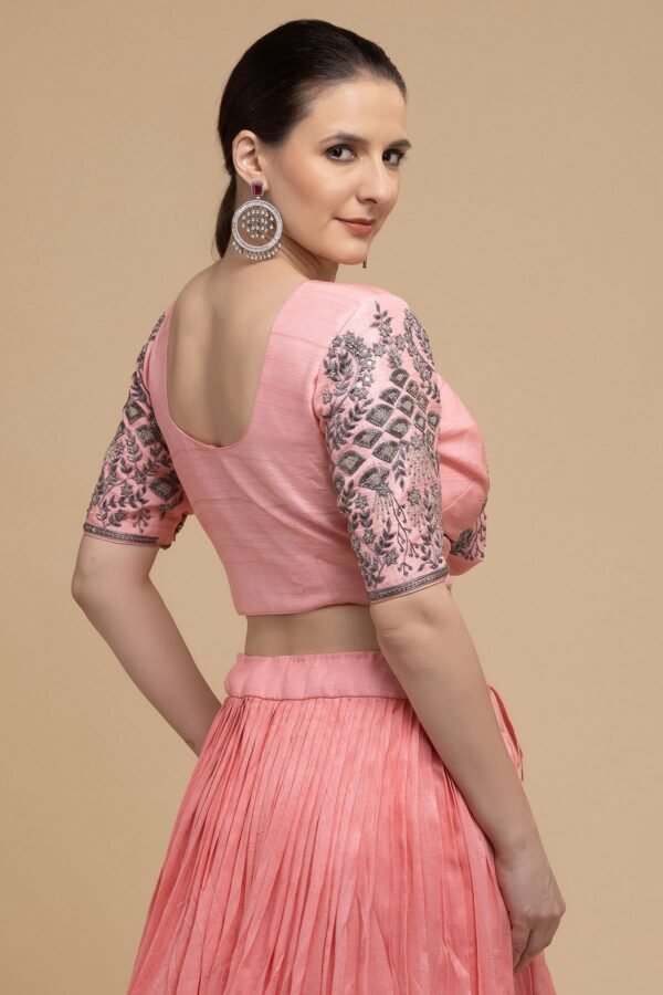 Lehenga Choli : Readymade Lehenga Choli Back Neck Pattern : U-Neck Lehenga Choli Color : Coral Pink Lehenga Choli Fabric : Raw Silk Lehenga Choli Front Neck Pattern : Jewel Neck Lehenga Choli Length : 15 Inches Lehenga Choli Sleeves : Elbow Length Lehenga Choli Work : Cutdana, Sequins & Bead Work Lehenga Lining Fabric : Santoon