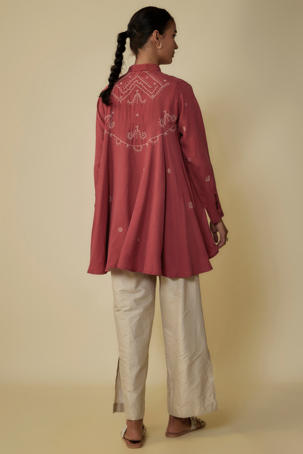 Featuring a crimson pink flared top in fine silk base with hand embroidery. Accentuate it with pants, minimal jewellery and flats for a complete look.