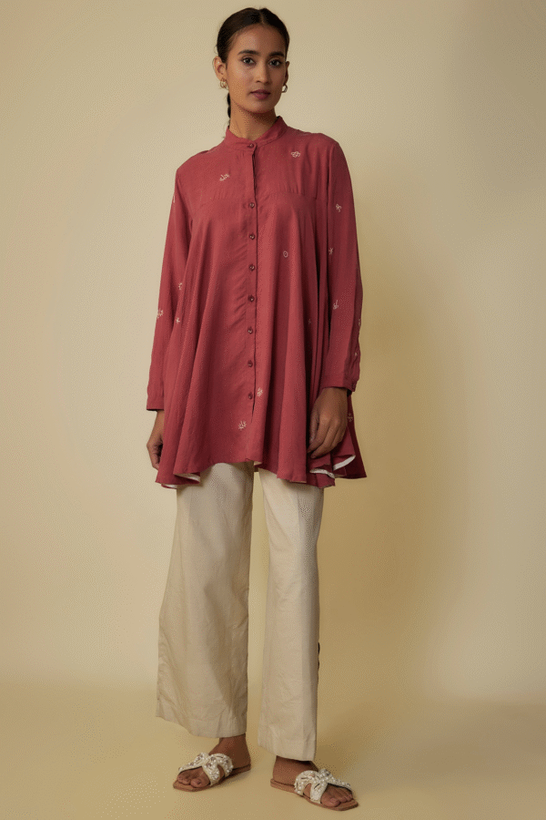 Be the first to review “Crimson Pink Fine Silk Hand Embroidered Flared Top” Cancel reply