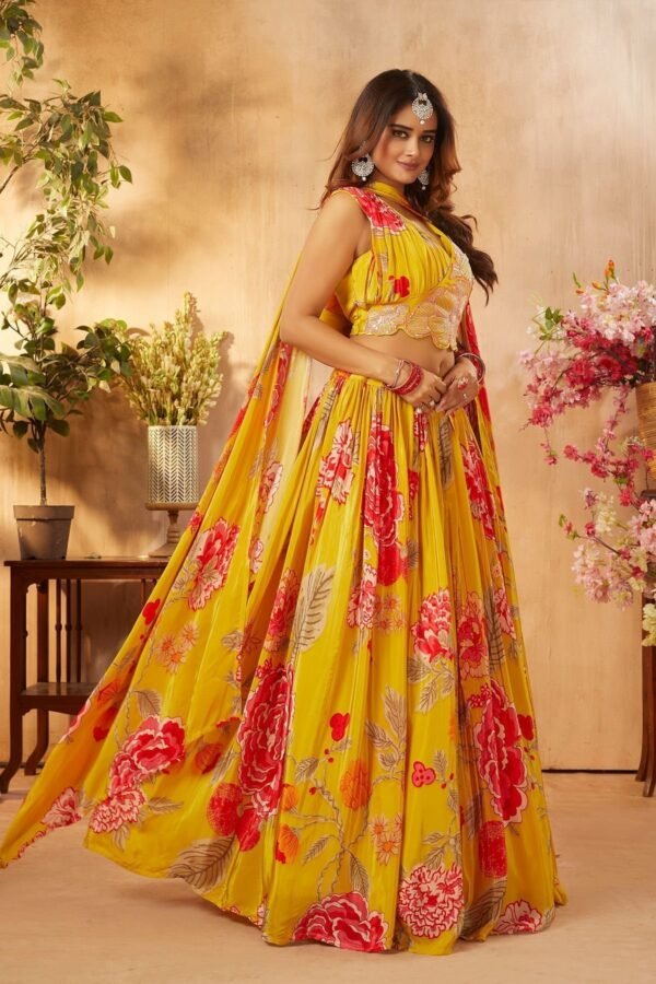 Golden Yellow Printed Crepe Party Wear Lehenga
