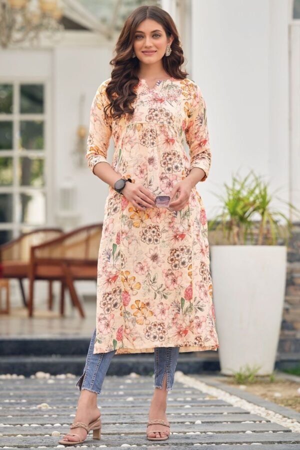 The Readymade Kurti is designed with a relaxed and flattering silhouette, offering a comfortable fit for all body types. It drapes beautifully, enhancing your natural curves and adding a touch of elegance to your casual look. The versatile design allows you to pair it with leggings, jeans, giving you endless styling options.