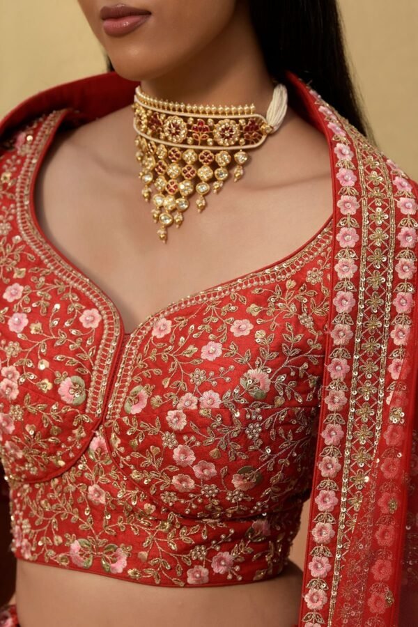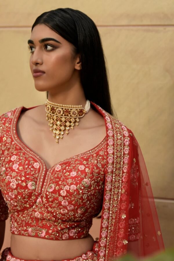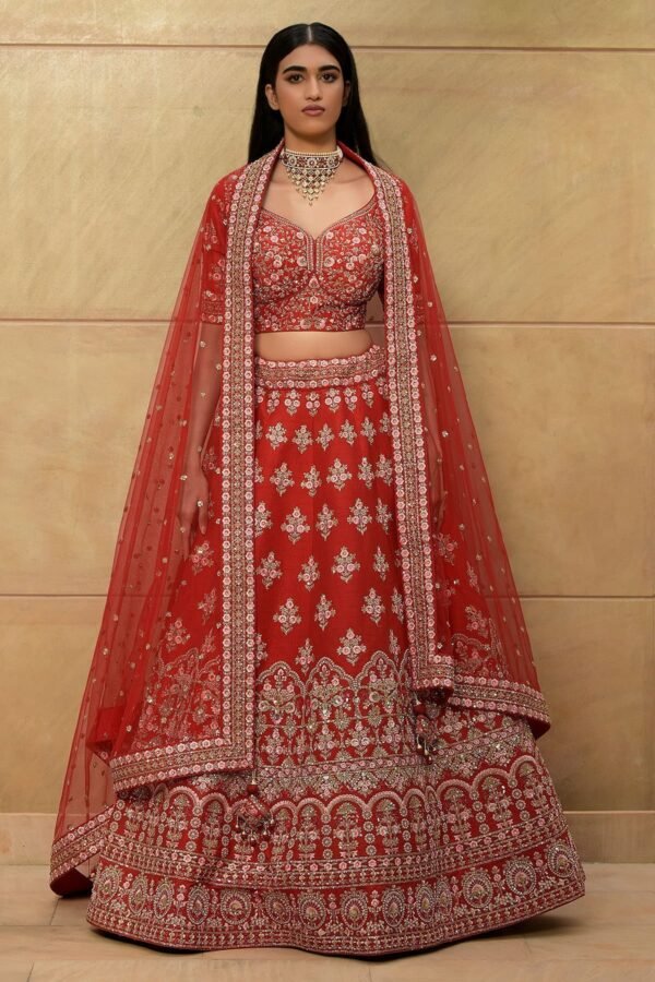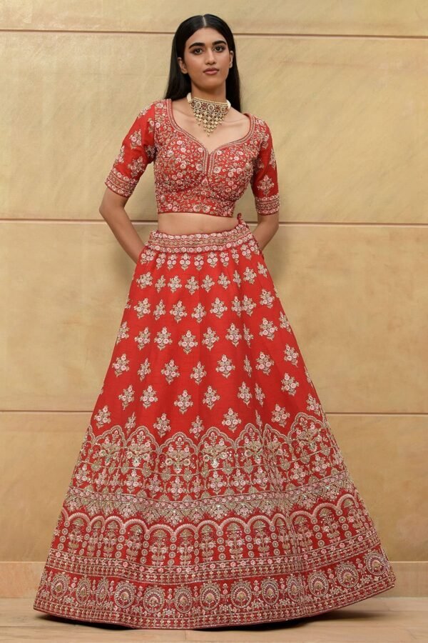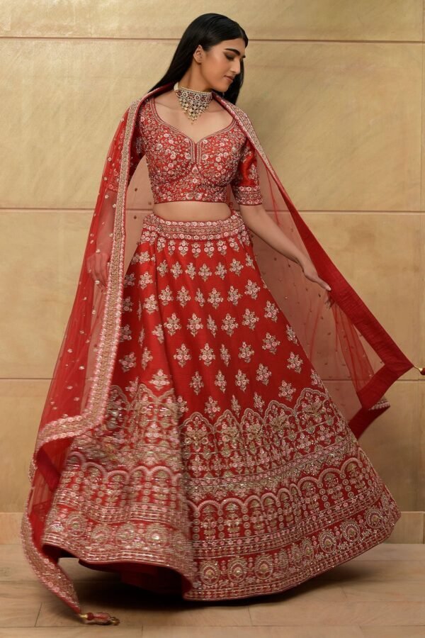 Be the first to review “Persian Red Zari Embroidered Raw Silk Bridal Lehenga” Cancel reply