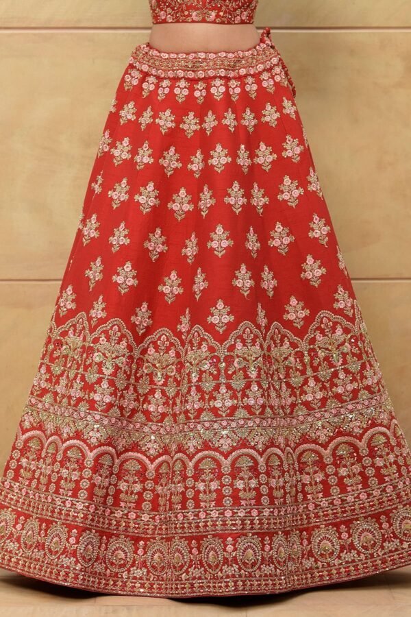 Lehenga Choli : Readymade Lehenga Choli Back Neck Pattern : Deep U-Neck Lehenga Choli Color : Persian Red Lehenga Choli Fabric : Raw Silk Lehenga Choli Front Neck Pattern : Sweetheart Neck Lehenga Choli Length : 38 cm Lehenga Choli Sleeves : Elbow Sleeves Lehenga Choli Work : Zari, Resham, Sequins, Cutdana, Zardosi & Pearl Work