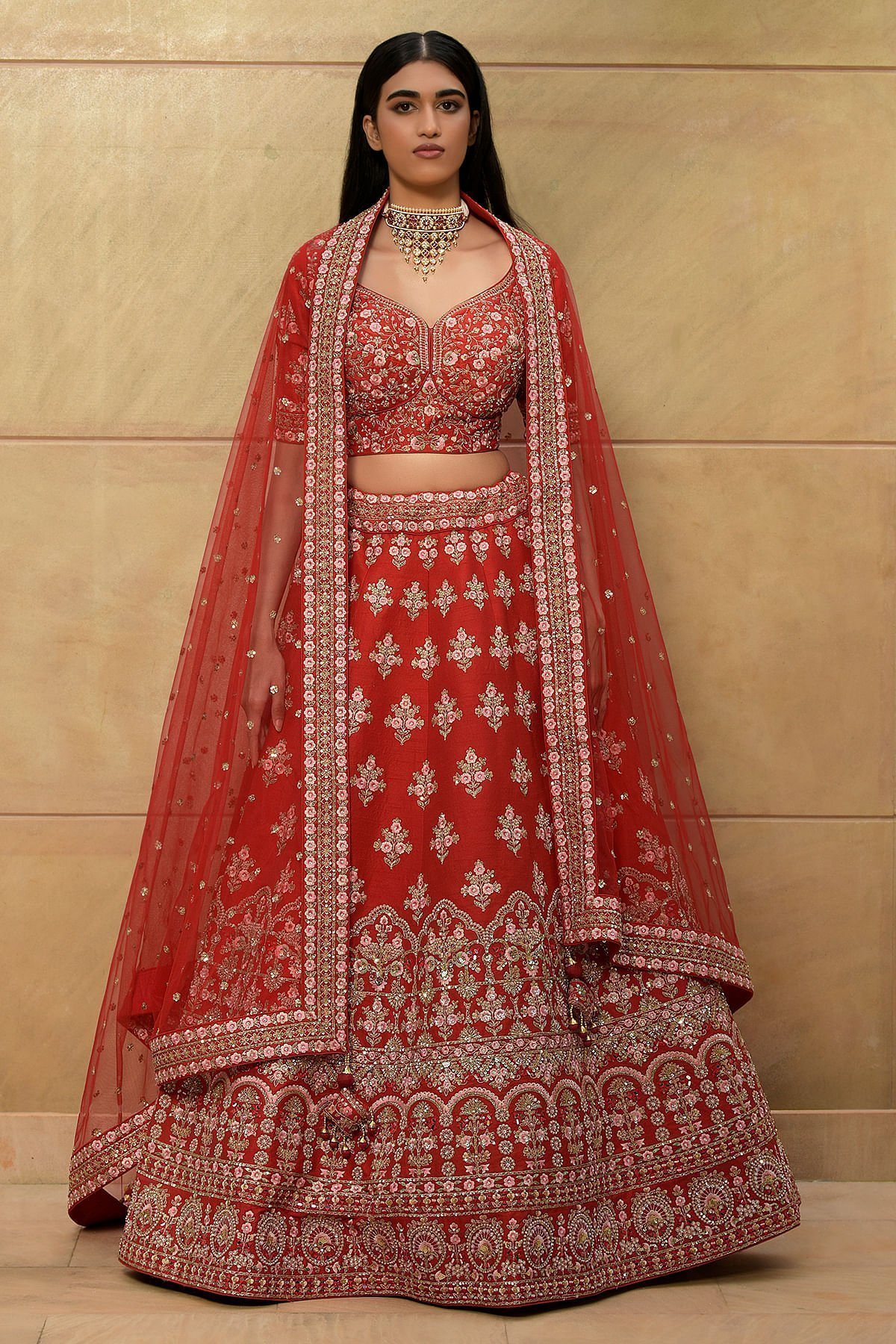Color : Red Craft : Embroidered Embellishment : Zari work Fabric : Silk Lehenga Color : Persian Red Lehenga Fabric : Raw Silk Lehenga Length : 112 cm Lehenga Style : Flared Lehenga Work : Zari, Resham, Mirror, Sequins, Cutdana, Zardosi & Pearl Work Purity : Pure - Dupatta